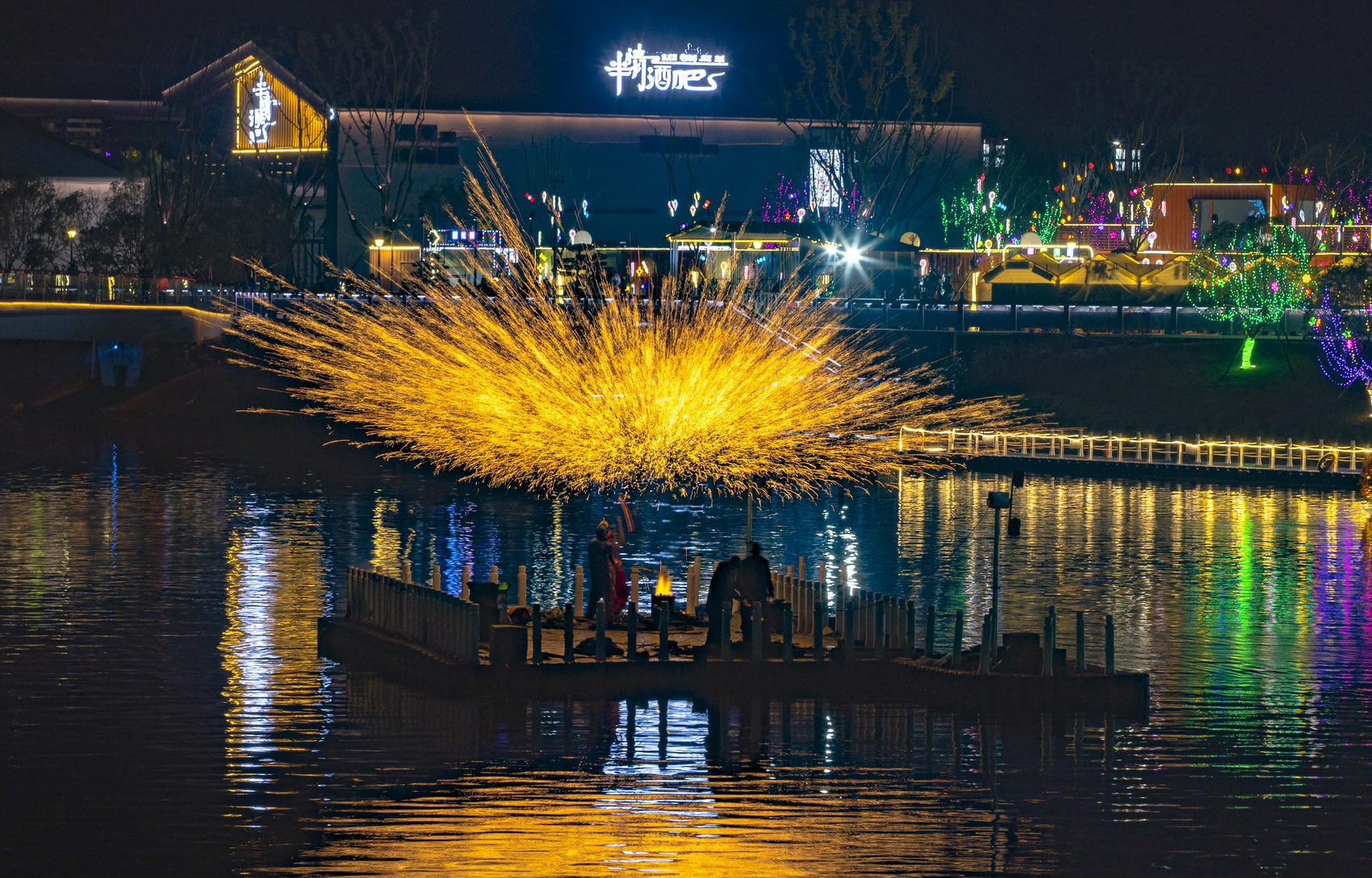 乘船除了观景,还能看戏。非遗绝技打铁花、火壶、火舞表演在水面舞台接连上演,当1600℃的铁水腾空而起,万点繁星般的铁屑化作绚烂“焰火”,在夜空中营造出梦幻般的视觉盛宴。