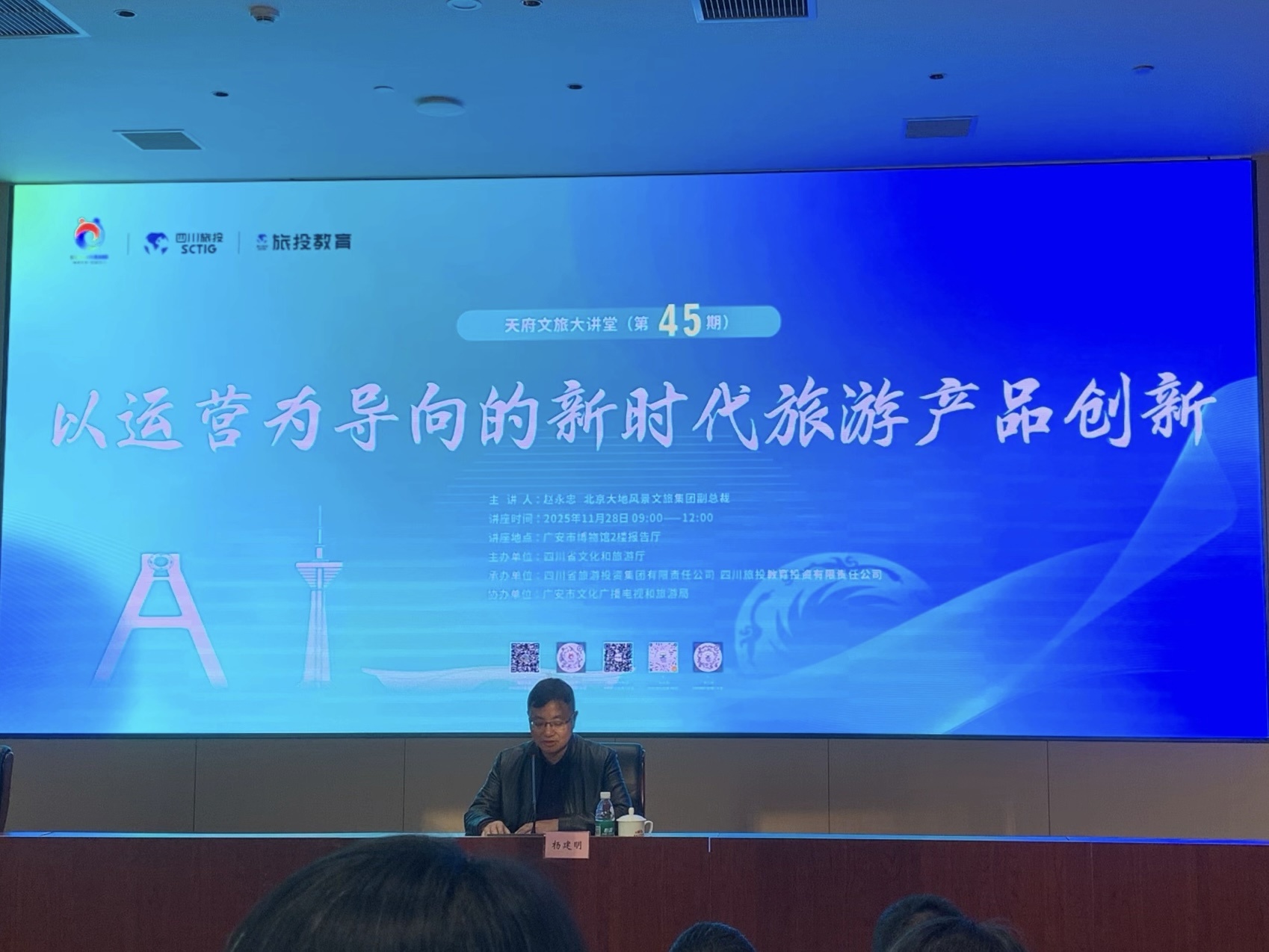 四川在线消息(蔡仪凡 广安频道 甘文颖)11月28日,天府文旅大讲堂(第45期)在广安市博物馆开讲。本期讲座特邀北京大地风景文化旅游发展集团有限公司副总裁赵永忠主讲,围绕“以运营为导向的新时代旅游产品创新”主题进行分享。广安市、县两级文旅部门、重点旅游景区、旅游民宿等文旅企业代表齐聚一堂,共话文旅发展新未来。