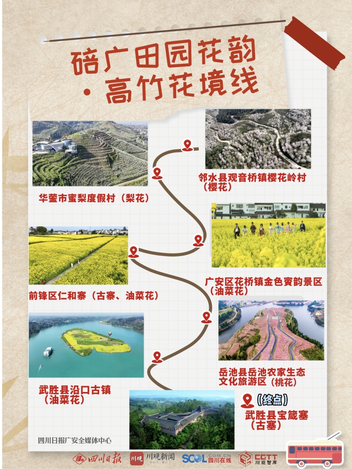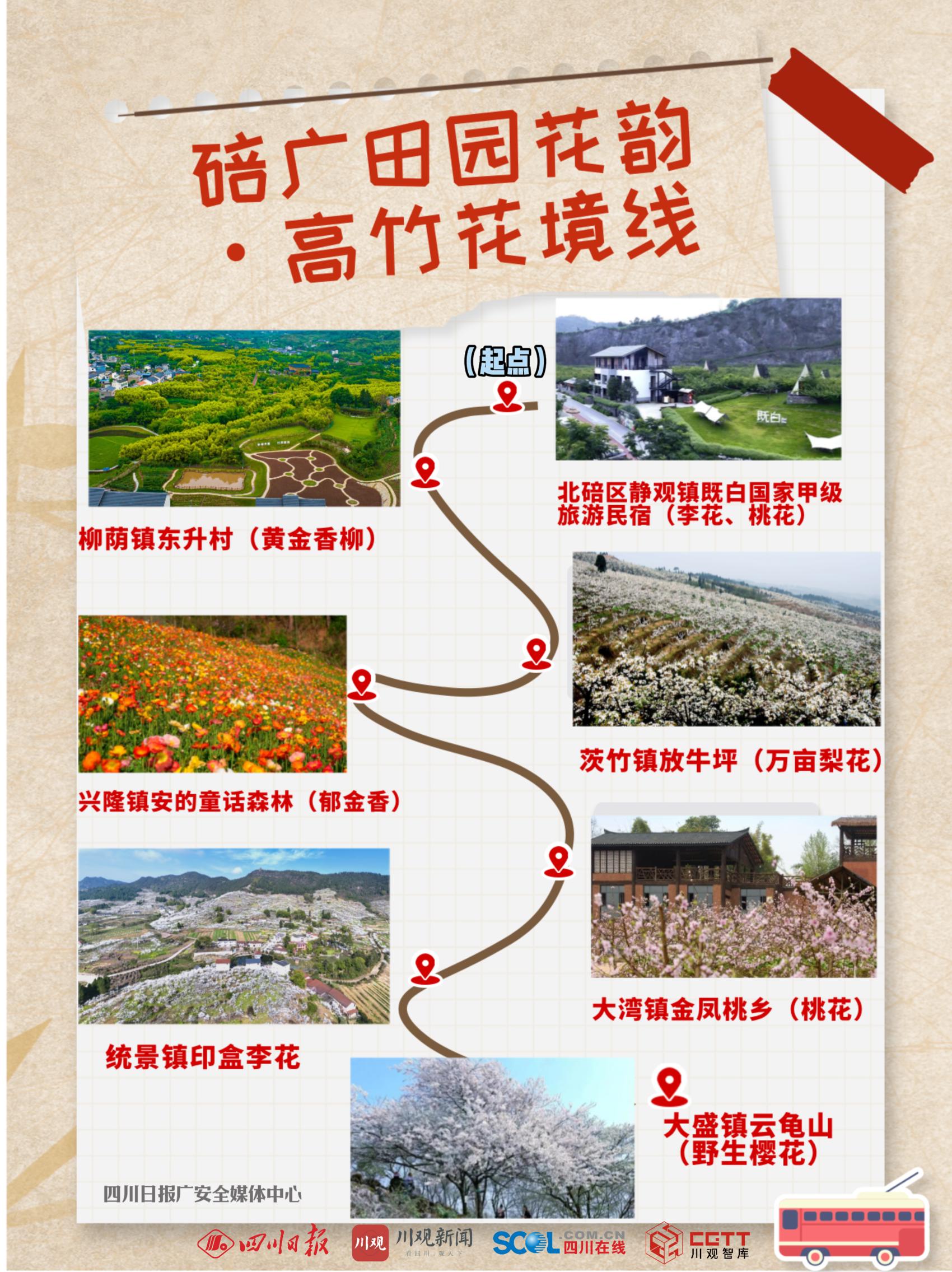 “碚广田园花韵·高竹花境线”则以春日花海为主轴,从北碚花境到川渝高竹新区万亩梨花,再延伸至广安油菜花、樱花等多点位花景,串起一条“繁花似锦”的春游动线。