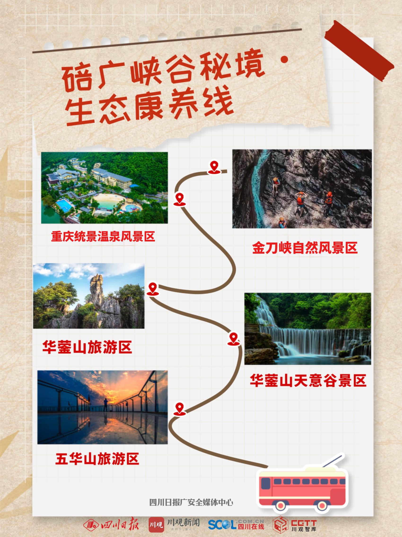“碚广峡谷秘境·生态康养线”联动金刀峡自然风景区、重庆统景温泉风景区与华蓥山天意谷等景区,融合峡谷探险与温泉康养,打造高品质生态休闲体验。