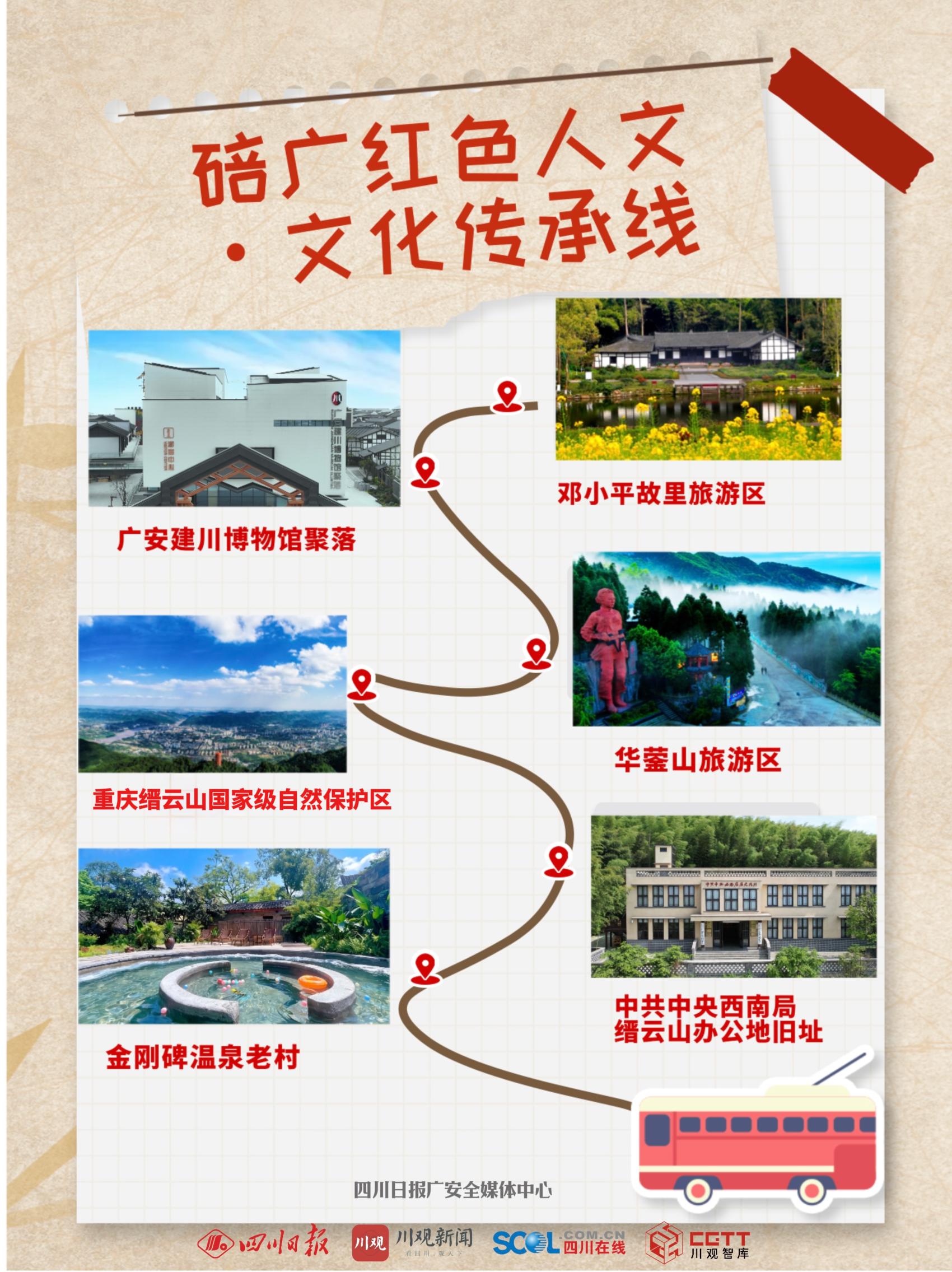 “碚广红色人文·文化传承线”以邓小平故里旅游区为起点,串联广安建川博物馆聚落、华蓥山旅游区及重庆缙云山国家级自然保护区等节点,将红色记忆与历史人文贯通成线。