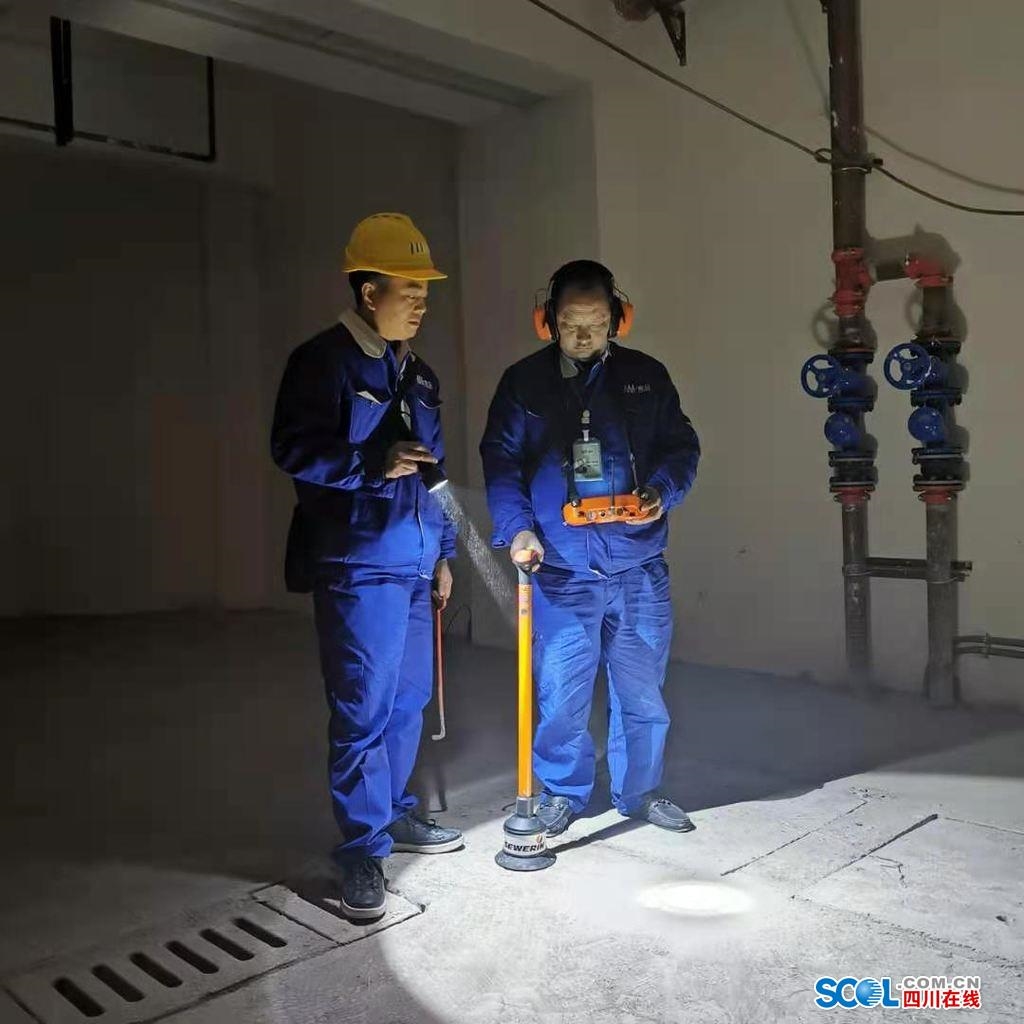 四川在线消息(彭娟 记者 何浩源) 12月4日凌晨2点,四个穿蓝色工作服的中年人带着工具箱、和一根长约1米4的听杆等,打着手电筒走进邻水某小区的地下车库。到达一水管处,一人用细长的听杆底部放在水管上,示意其他人安静后,将耳朵贴上顶端的听筒。静悄悄的车库,只能听见细微的工具移动声以及时不时的交谈声。