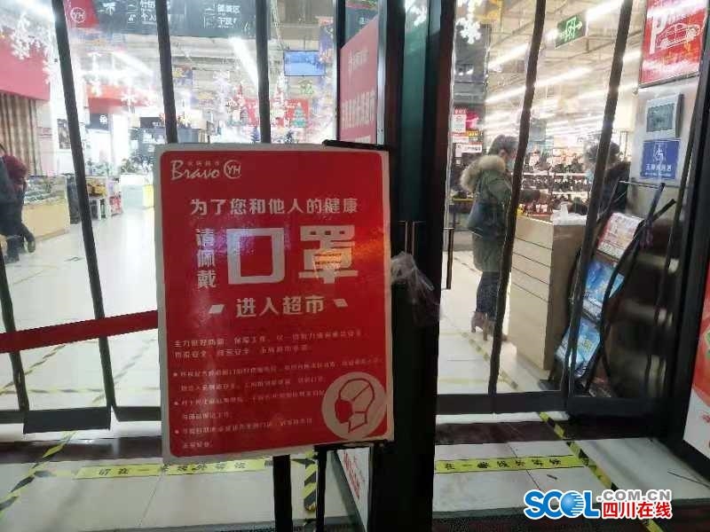 12月13日下午5点30分左右,永辉超市门口立着“为了你和他人的健康,请佩戴口罩进入超市”的红色警示牌。记者看到,一名戴着口罩,手拿测温器的工作人员站在入口处。待两名女子进入时,便迎上去测温。