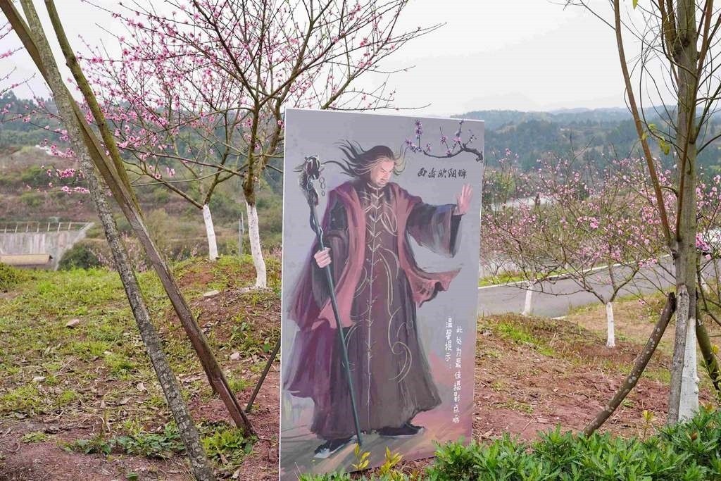 被湖水环绕的桃花岛上,大片玫红色桃花开得正艳,空气中飘散着芬香气息。桃林中还有众多武侠剧主角的人形立牌:黄蓉、郭靖、白浅……,引得游客合影留念。