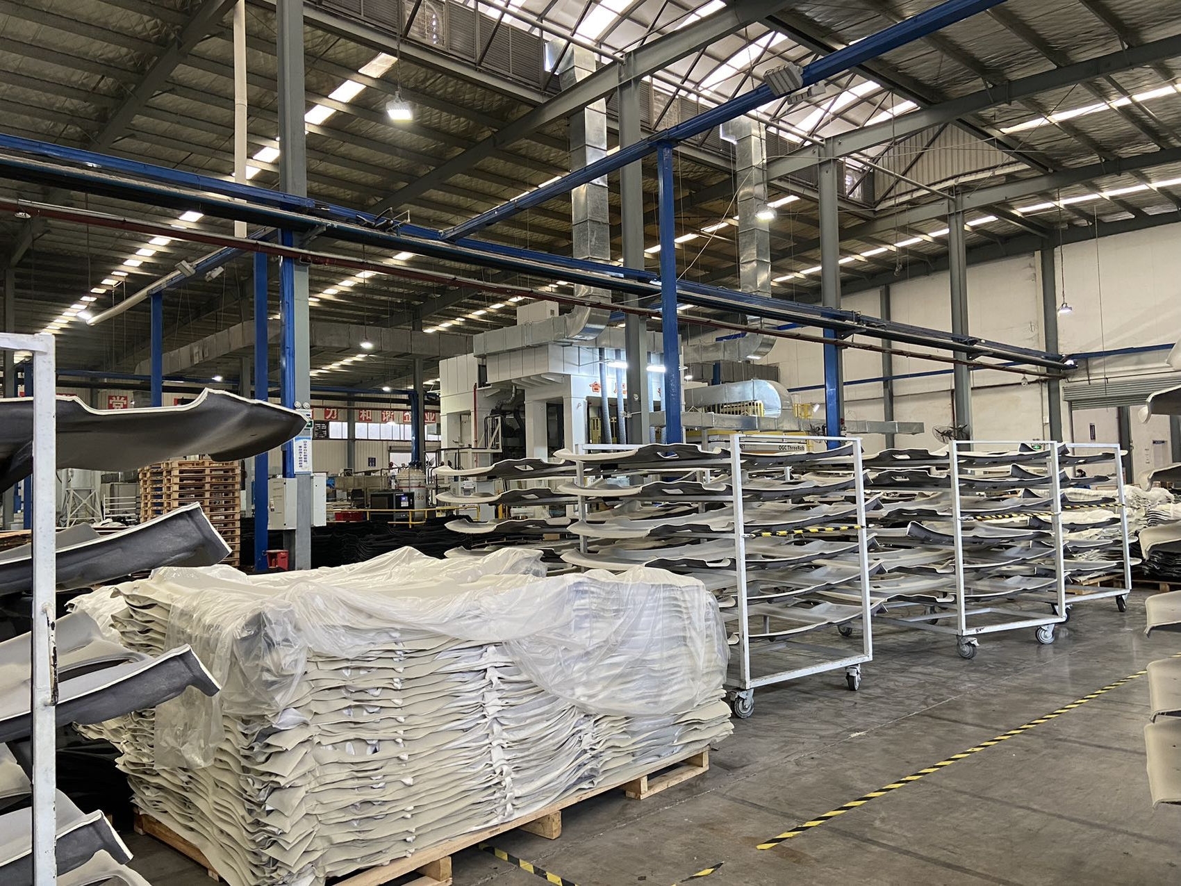 拓普公司厂房内,刚生产出的汽车零部件整齐排列。邓涵予/摄