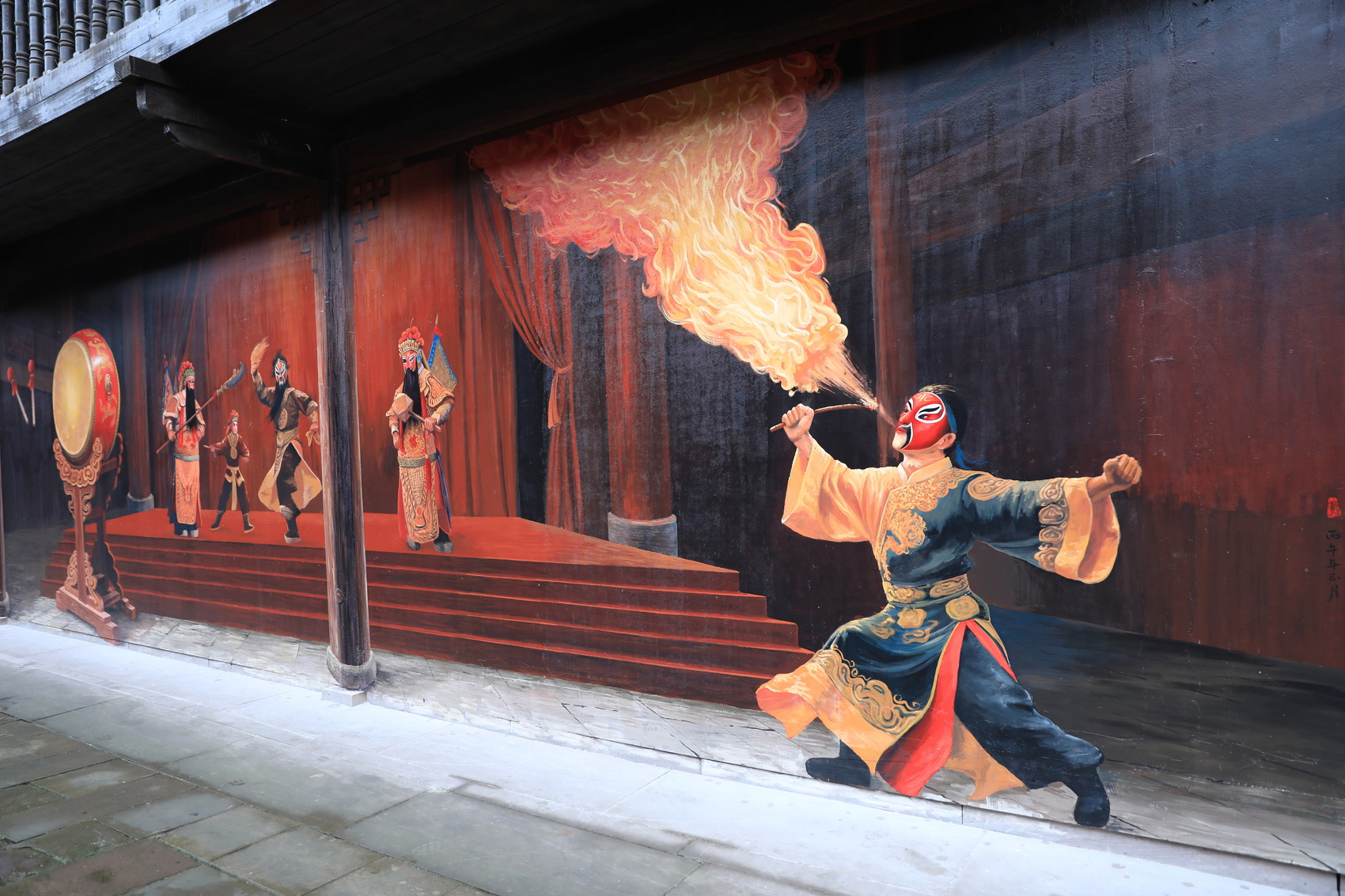 与传统街区不同的是,此条3D长街“可逛、可玩、可拍”。整条街以老街肌理为载体,将川东民俗风情、广安本土生活与川剧非遗融入立体画面之中。游客行走其间,不只是看画,更像是进入日常生活场景:杀年猪、磨豆浆、摆坝坝茶等熟悉的市井画面跃然脚下。