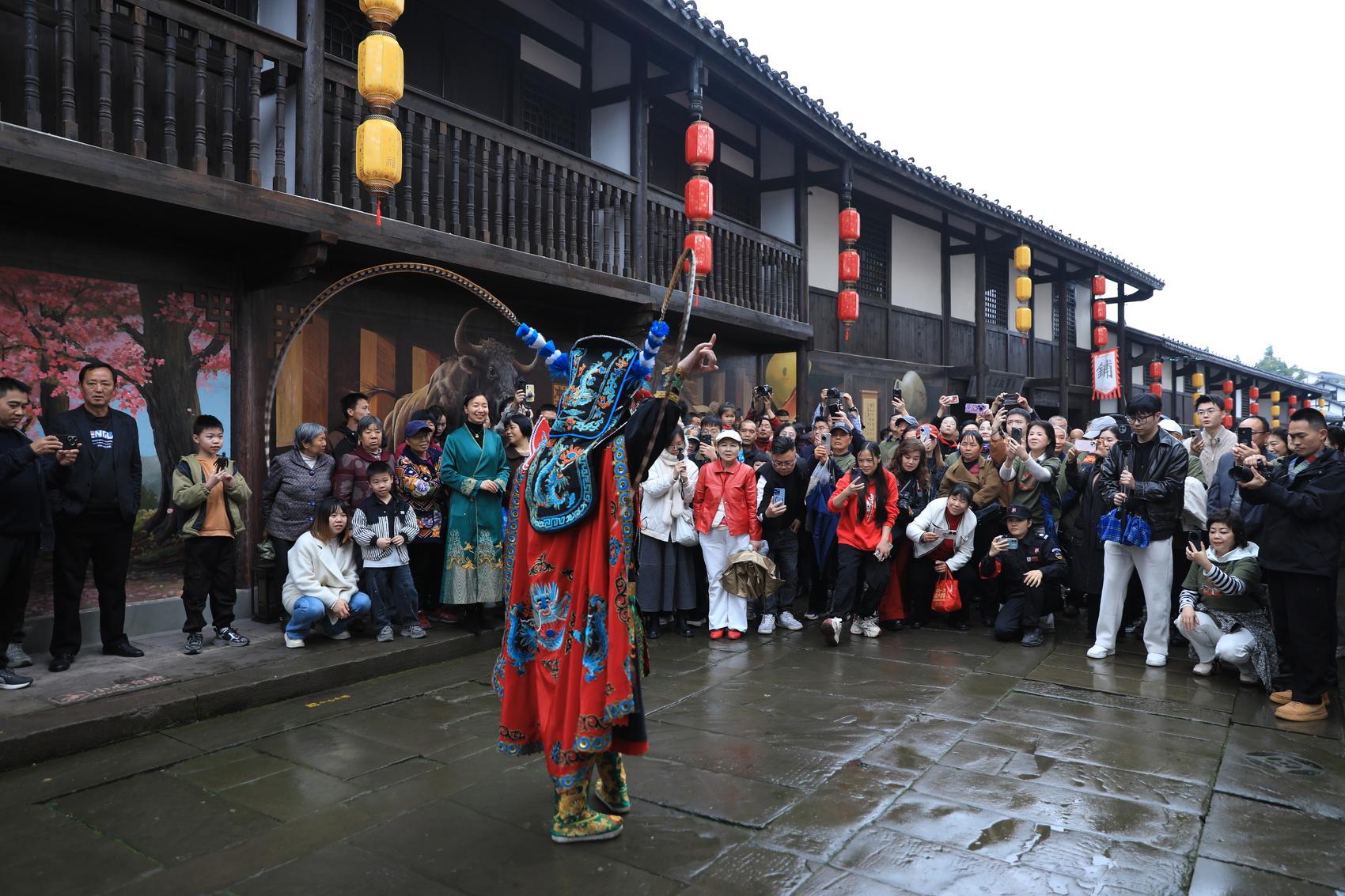 开街仪式现场,击鼓开街率先点燃气氛,鼓声在老街巷道间回荡。紧接着,川剧变脸、非遗连厢等民俗表演轮番登场,演员与游客近距离互动,传统文化的热闹与老街烟火气交织在一起,现场人气迅速聚集。