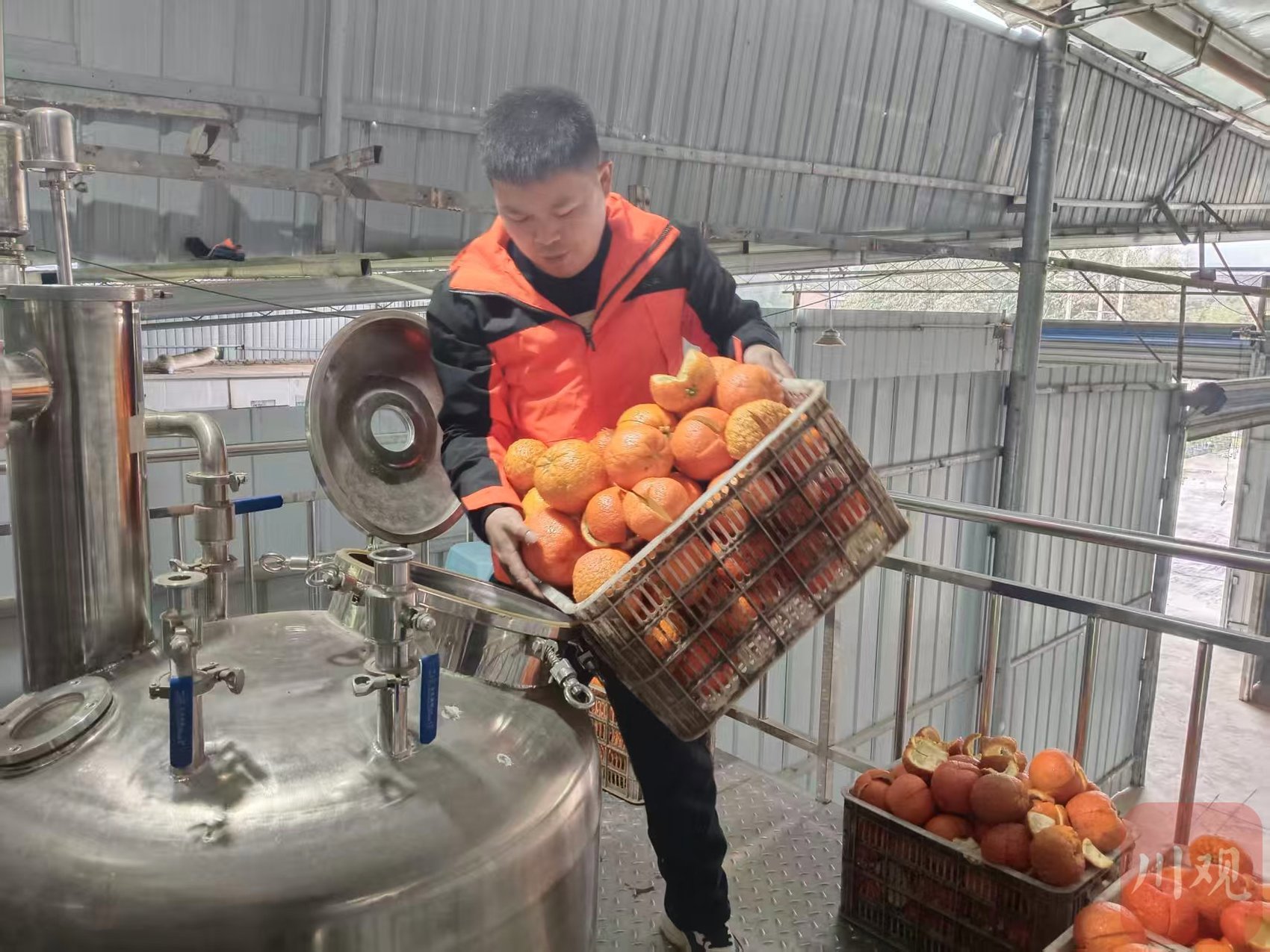 走进加工车间,工人正对果皮和果肉称重,准备进入下道工序。“这套精油纯露提取罐功能很全,鲜果剥壳后,果皮可提取精油,果肉等可混合高粱、糯米等发酵酿酒。”罗超介绍,经过工厂设备高温高压处理,半小时可提取纯露,40分钟可提取精油。这些从中药材延伸出来的产品,两天内会出现在四川、重庆、湖南、河南、安徽等地的医药厂、食品厂和日化厂。