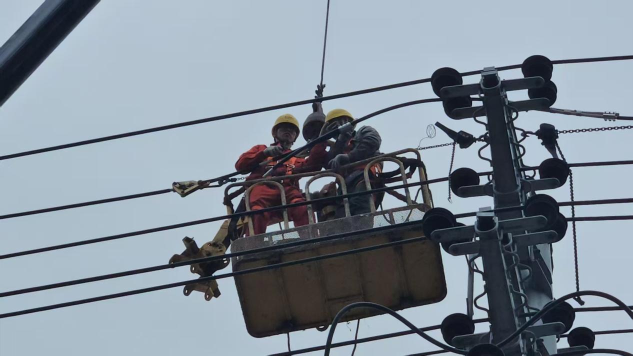 此时,虽然雨渐小,但是登杆难度仍然较大,抢修人员们毫不犹豫地系好安全绳,登上杆顶。收线、接线、紧线、固定……每一个步骤都紧张有序,他们与时间赛跑,额头上的雨水与汗珠也顾不上擦拭。因为他们知道,必须尽快修复故障线路,确保电网整体运行安全。