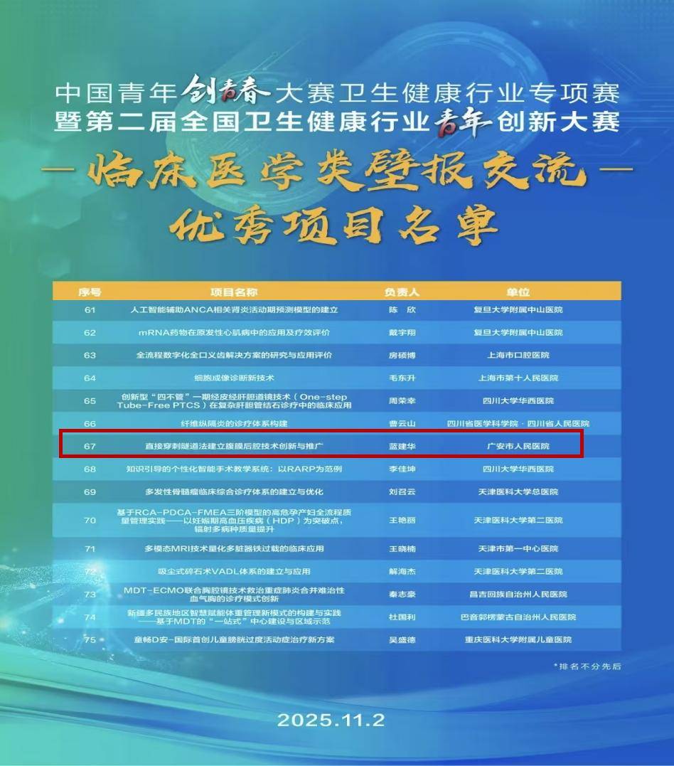 四川在线消息(杨林 广安频道 彭娟)日前,中国青年创青春大赛卫生健康行业专项赛暨第二届全国卫生健康行业青年创新大赛总决赛在北京市举行,75个优秀项目入选临床医学类“壁报交流优秀项目”名单。其中,由广安市人民医院泌尿外科蓝建华团队选送的《直接穿刺隧道法建立腹膜后腔技术创新与推广》项目位列其中,也是四川省临床医学类入选的4项晋级项目之一。
