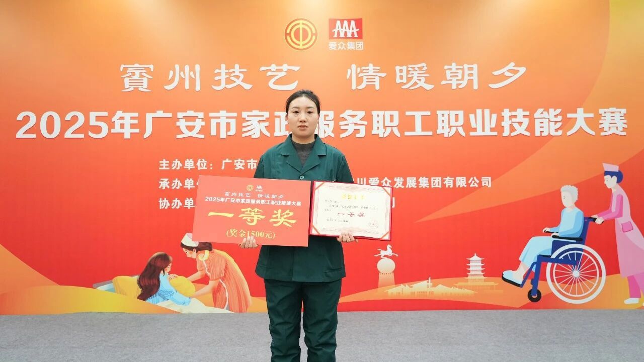 经过激烈角逐,来自四川爱众乐享医养产业有限公司的青年护理人才赵庆蓉凭借扎实的理论功底、娴熟的实操技能,在大赛养老护理类别角逐中脱颖而出,成功斩获一等奖。