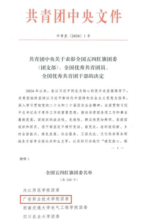 四川在线消息 近日,共青团中央印发了《关于表彰全国五四红旗团委(团支部)、全国优秀共青团员、全国优秀共青团干部的决定》(中青发〔2026〕1号)。广安职业技术学院团委获“全国五四红旗团委”荣誉称号,实现学校共青团工作在该项荣誉上零的突破。这既是上级团组织对该校青年工作的阶段性认可,更是对近年来校团委坚持围绕立德树人根本任务、系统推进改革与建设的肯定。