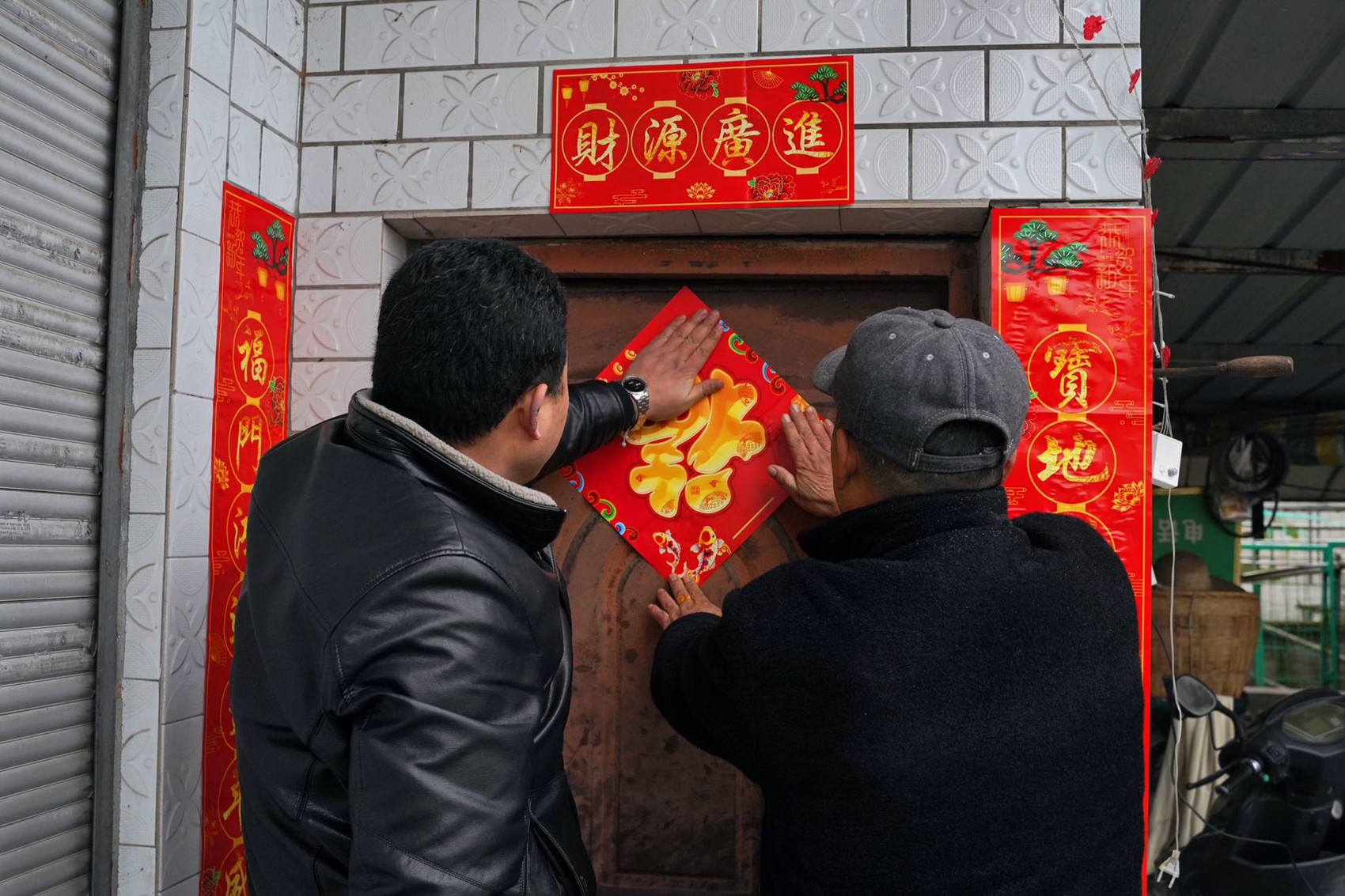 驻村干部为群众上门贴春联。 吴迪 摄