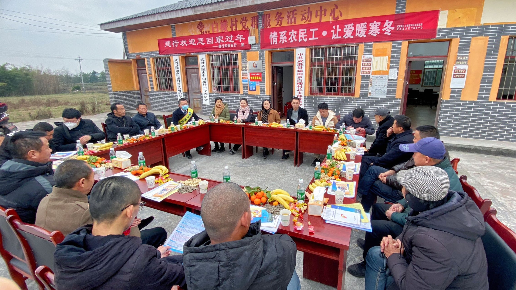 一张张会议桌,围成一个方形,20多位返乡农民工与县农民工服务中心、猛山乡及白楼村干部开起了坝坝会,主办方还准备了香蕉、橘子、矿泉水。胡鑫一入座就看到桌上一人一份摆放的一整套资料,拿起一份《武胜县农民工服务指南》仔细阅读起来。